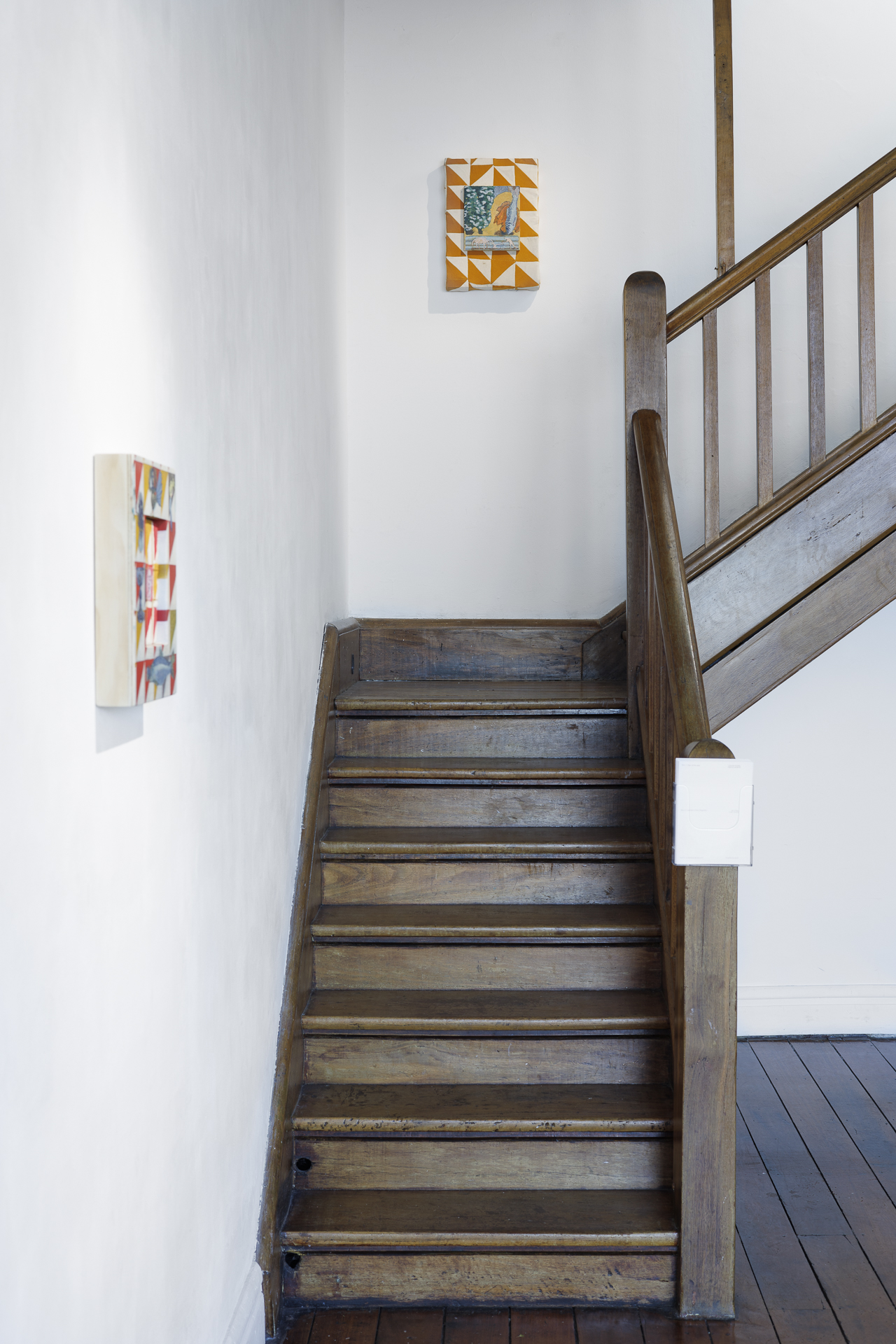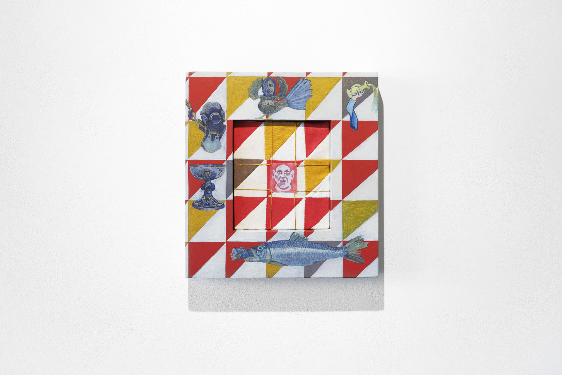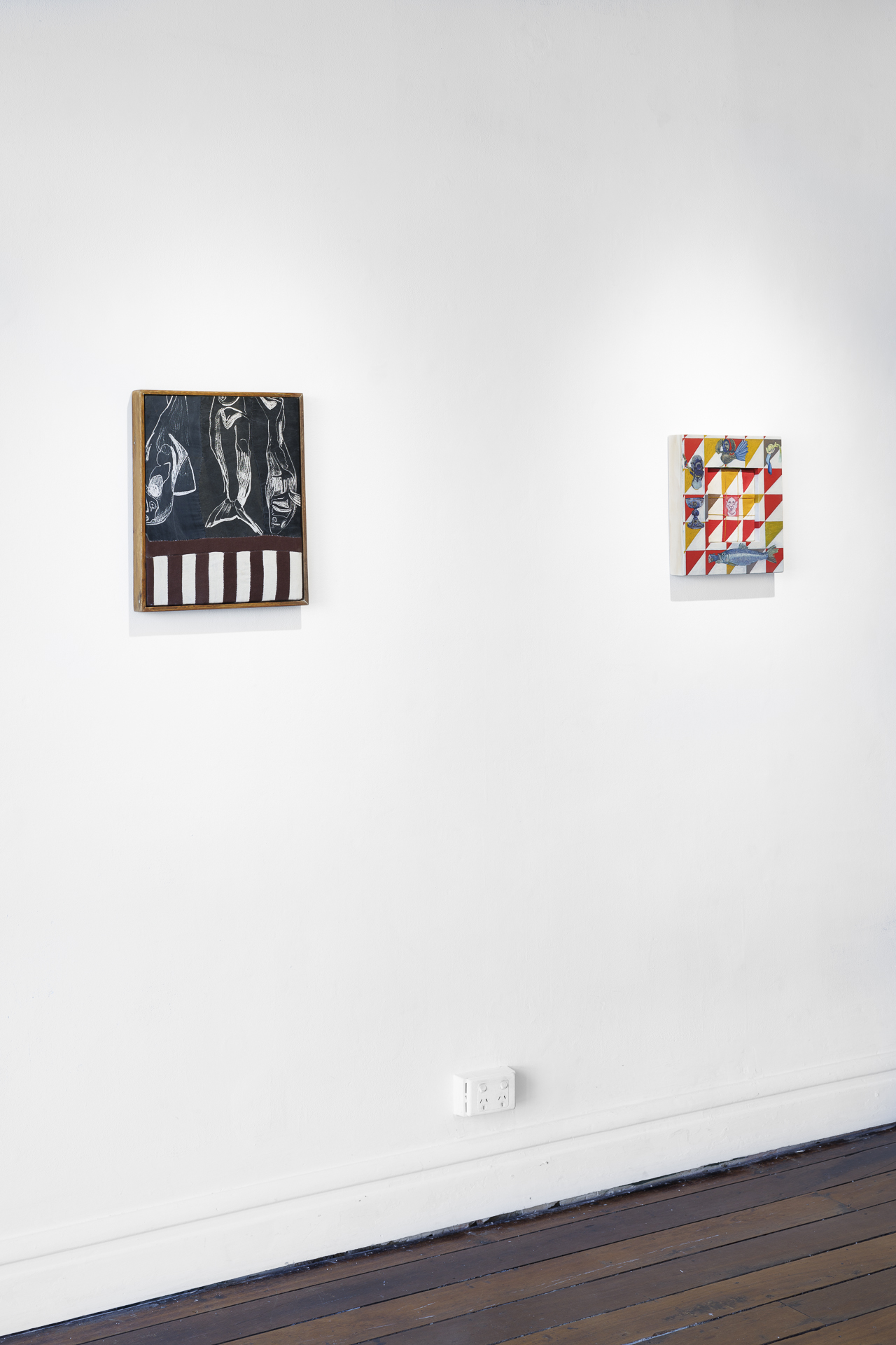 The quilt-paintings for this exhibition began in an exchange of gifts between two artists, and friends. Based on different continents, Hurley sent Leyland stitched fabric designs, and Leyland sent Hurley paintings on different surfaces. Each then worked back into the objects made by the other, and from this system emerged the rich visual world which you can see in this exhibition, an exhibition made from a constellation of complex, highly-individualised artworks, each a blend of 2-D and 3-D, soft and hard materials, geometric design and painted images.